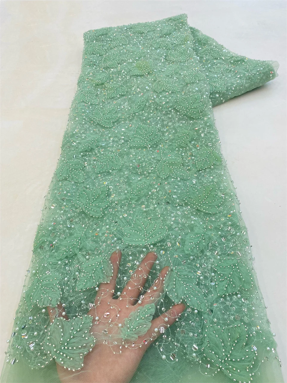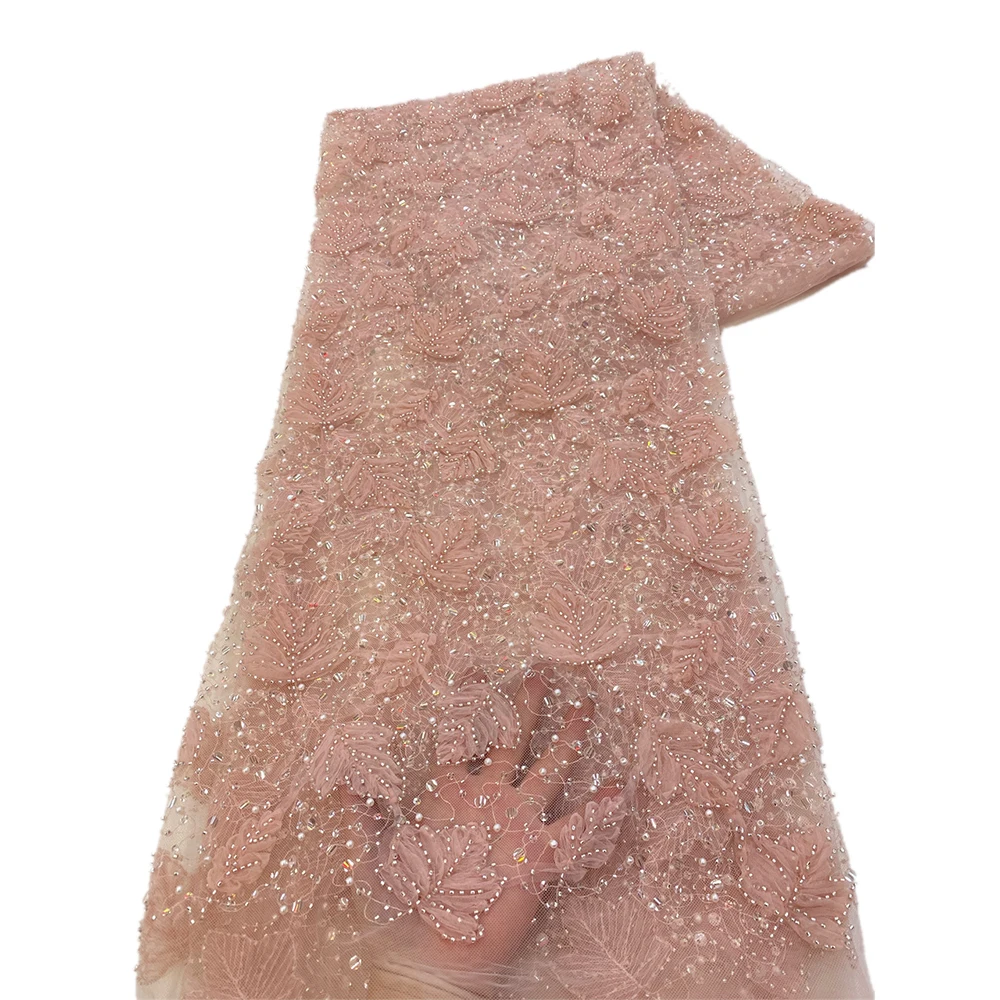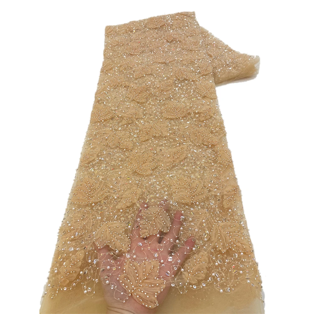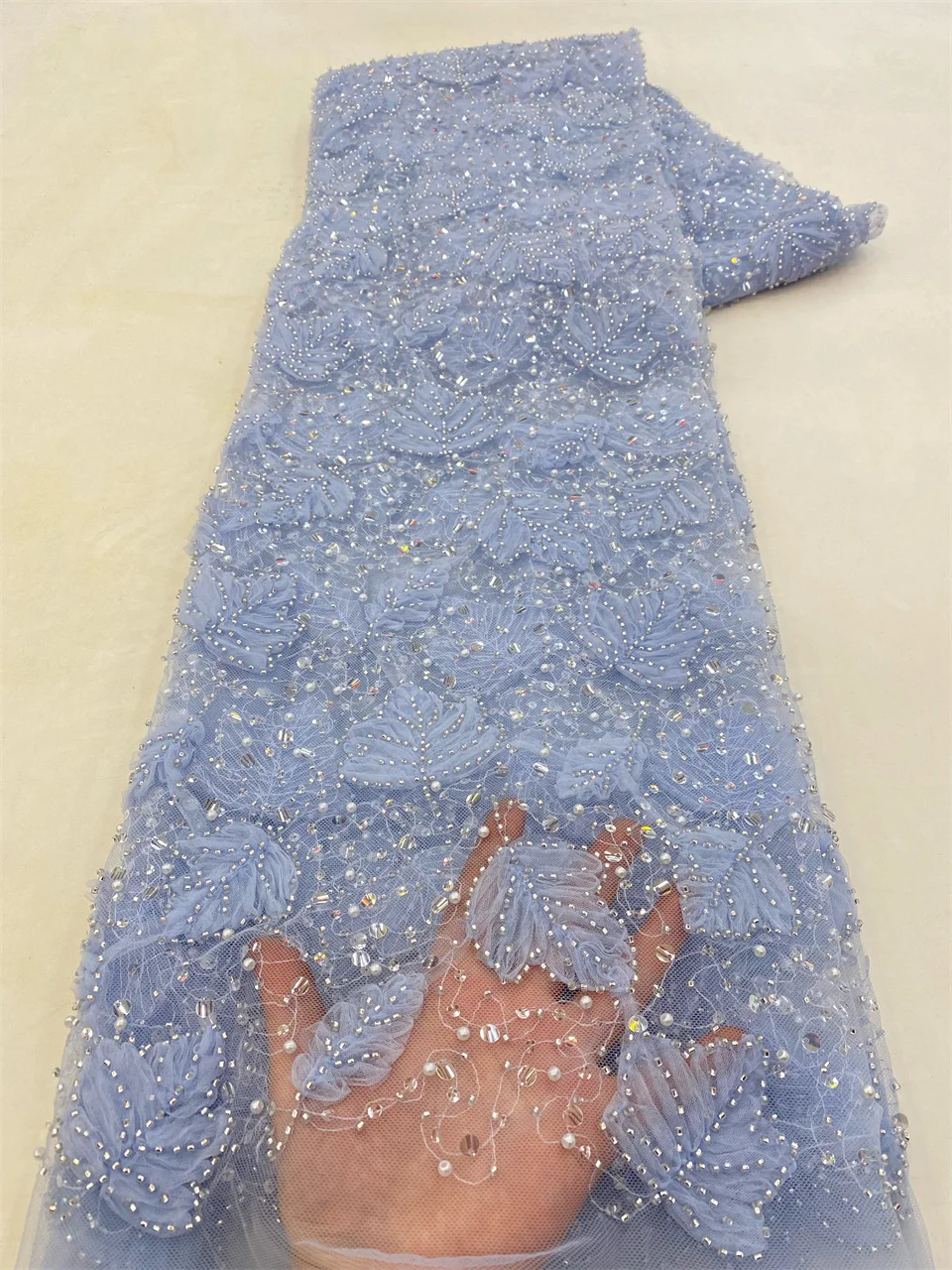 2023 Blue 3D Flower Lace Fabric With Pearls High Quality French Heavy Bead Tulle African Fabric For Wedding Party Dress Sewing