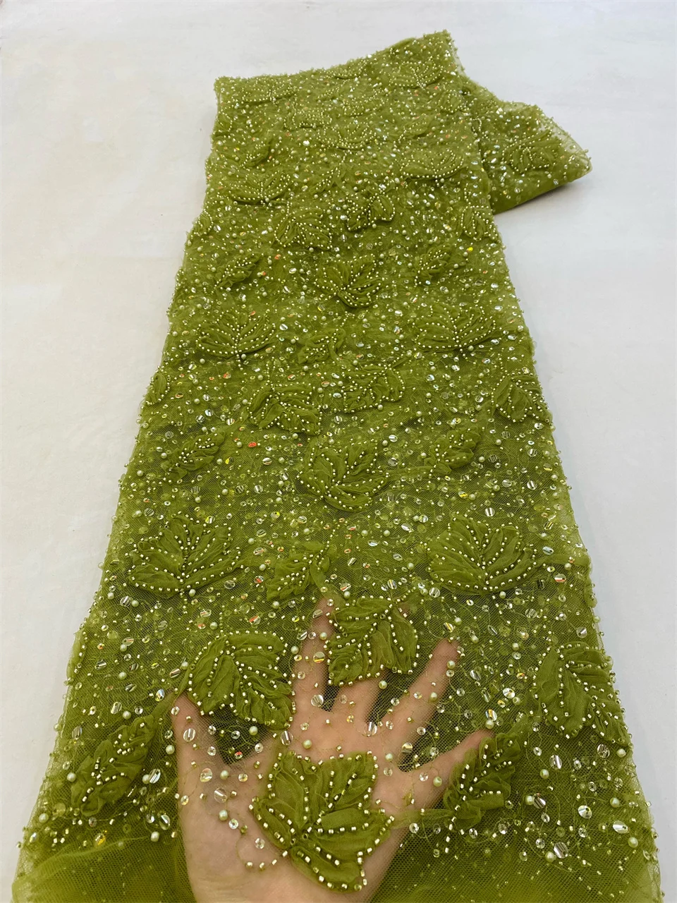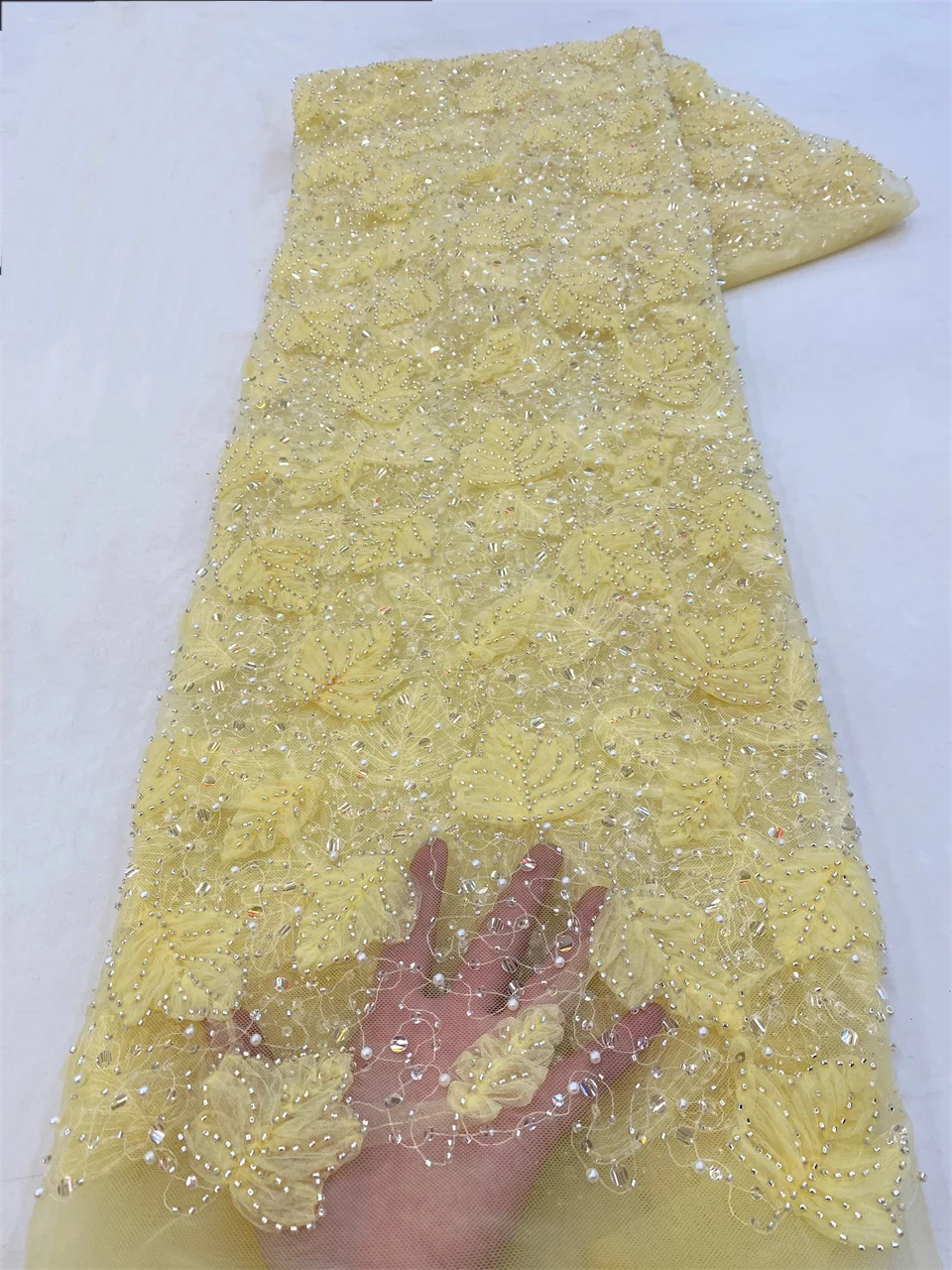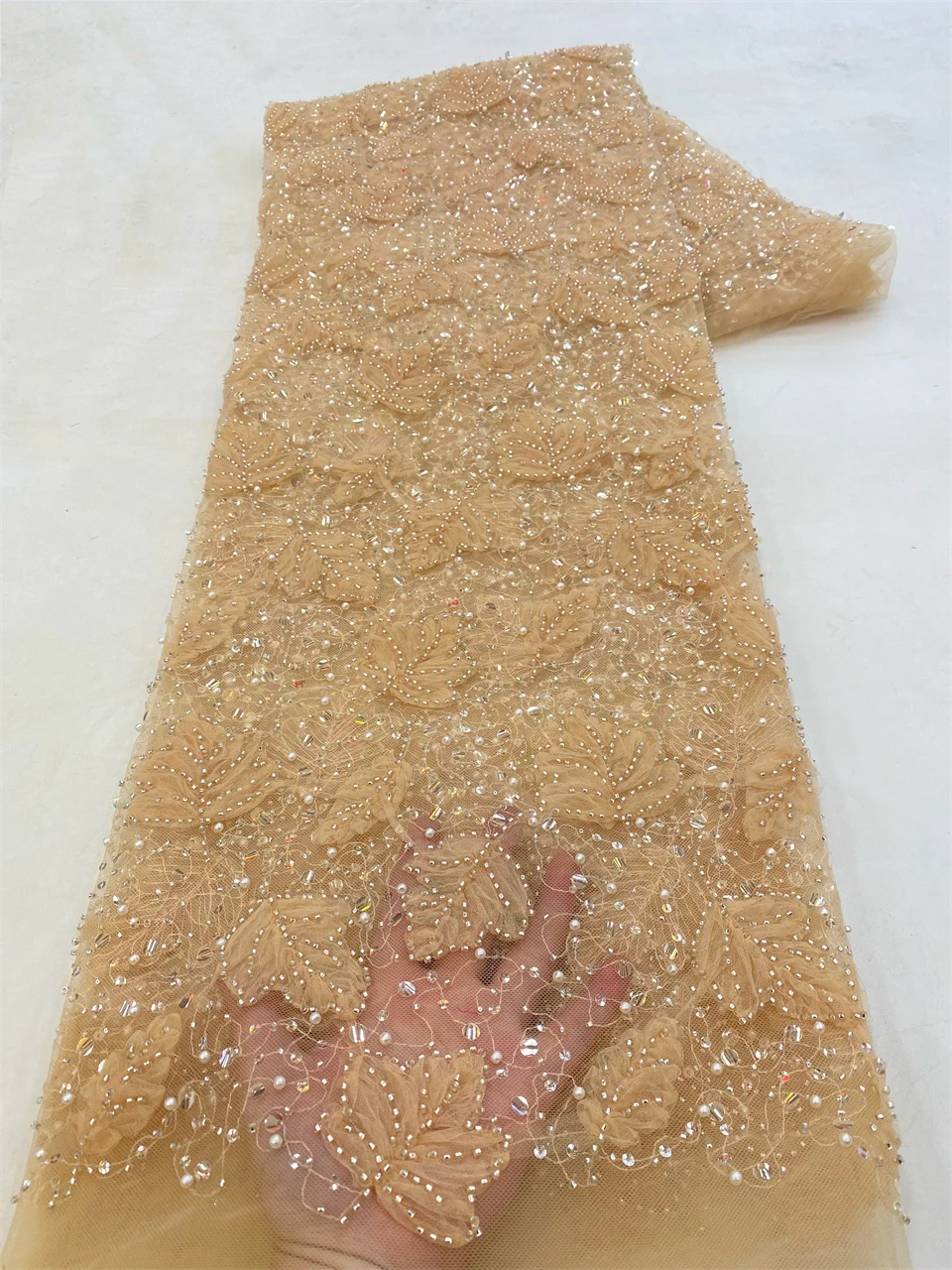 2023 Blue 3D Flower Lace Fabric With Pearls High Quality French Heavy Bead Tulle African Fabric For Wedding Party Dress Sewing